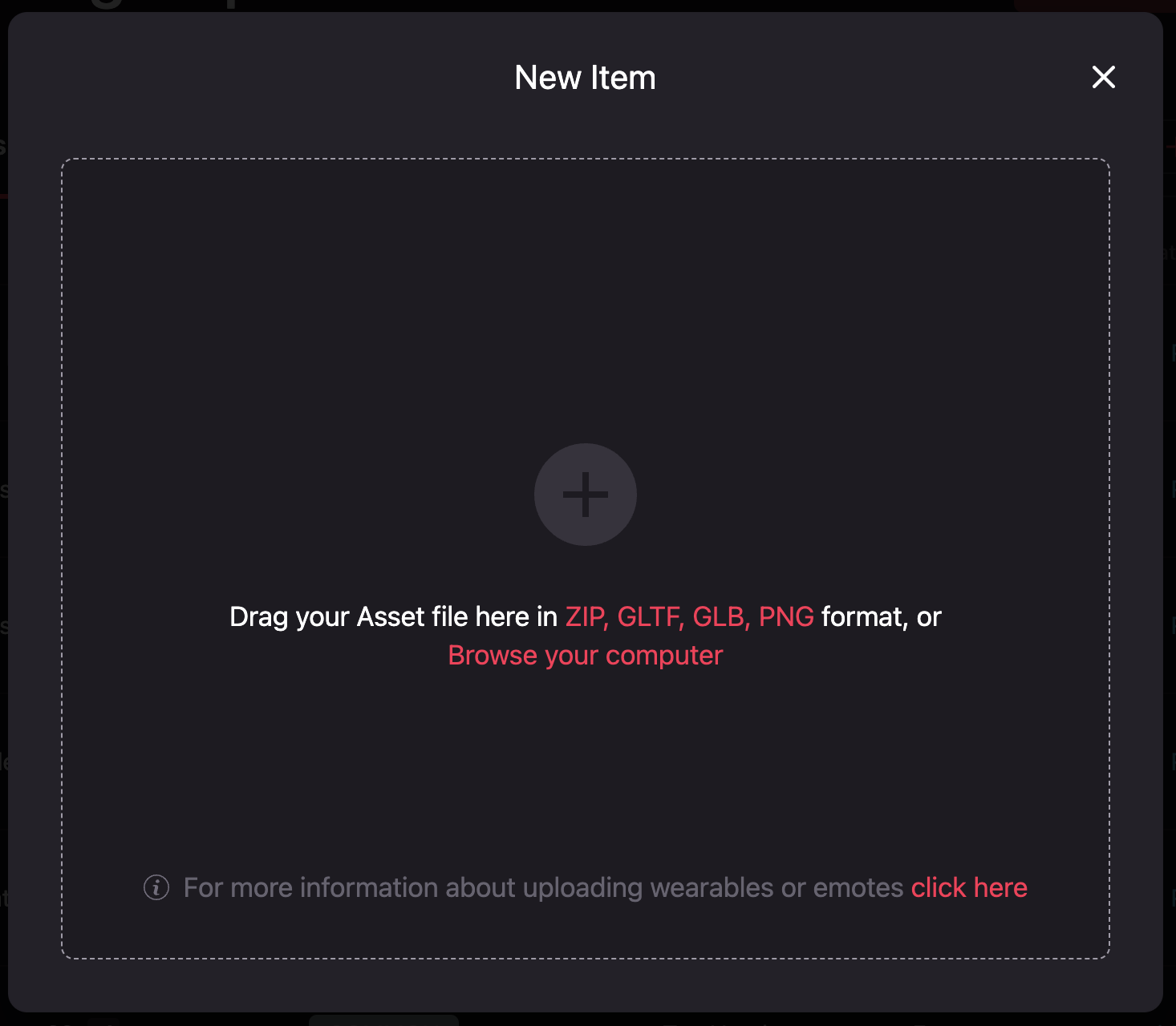 Remember that you need to create a collection before uploading your file. If you don’t know how to do that, check Creating a Collection . To upload your Smart Wearable, drag and drop the file on the New Item window or browse your computer. It will automatically detect if the file is a Smart Wearable. Remember that the collection max file size is 3MB.