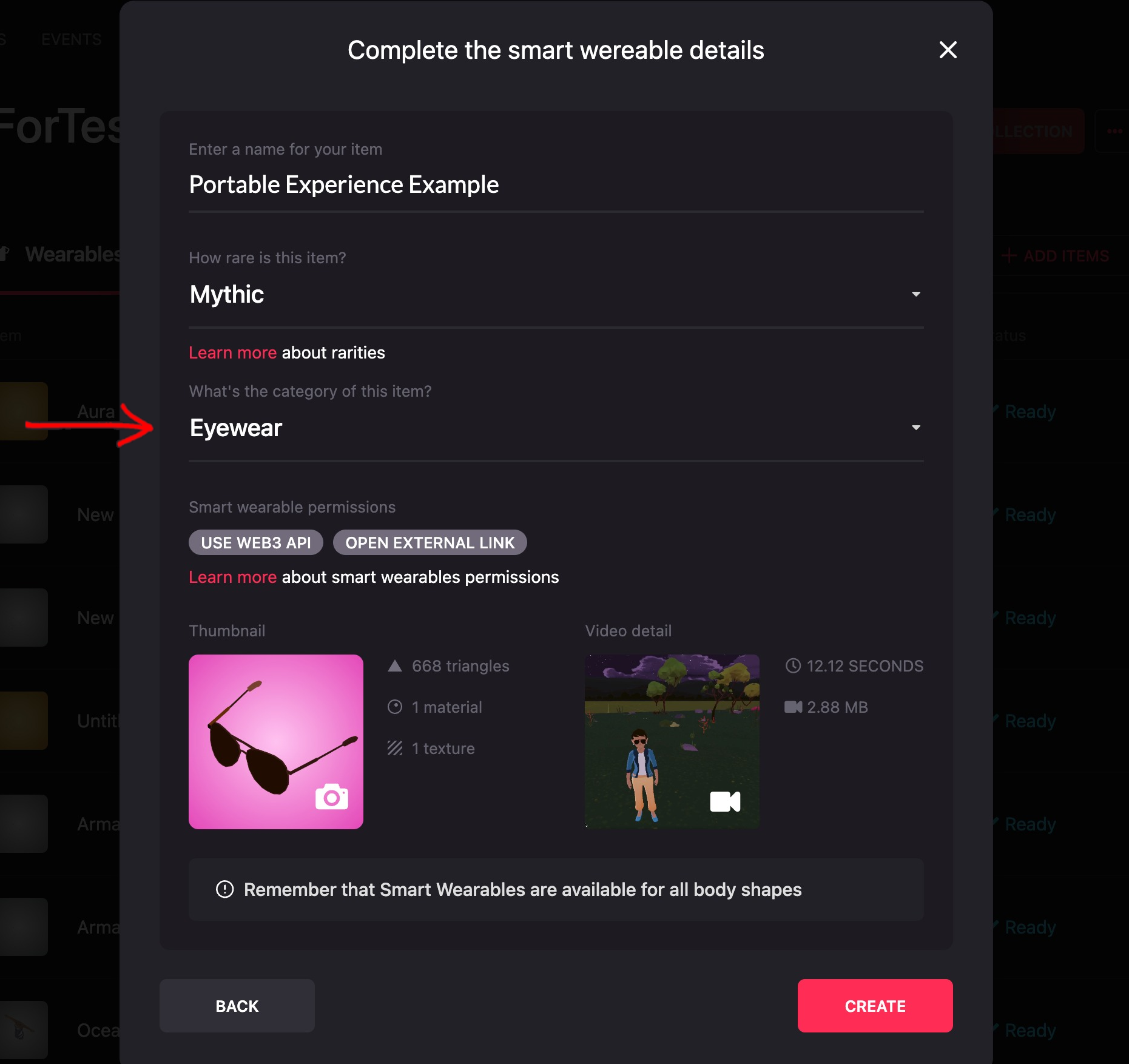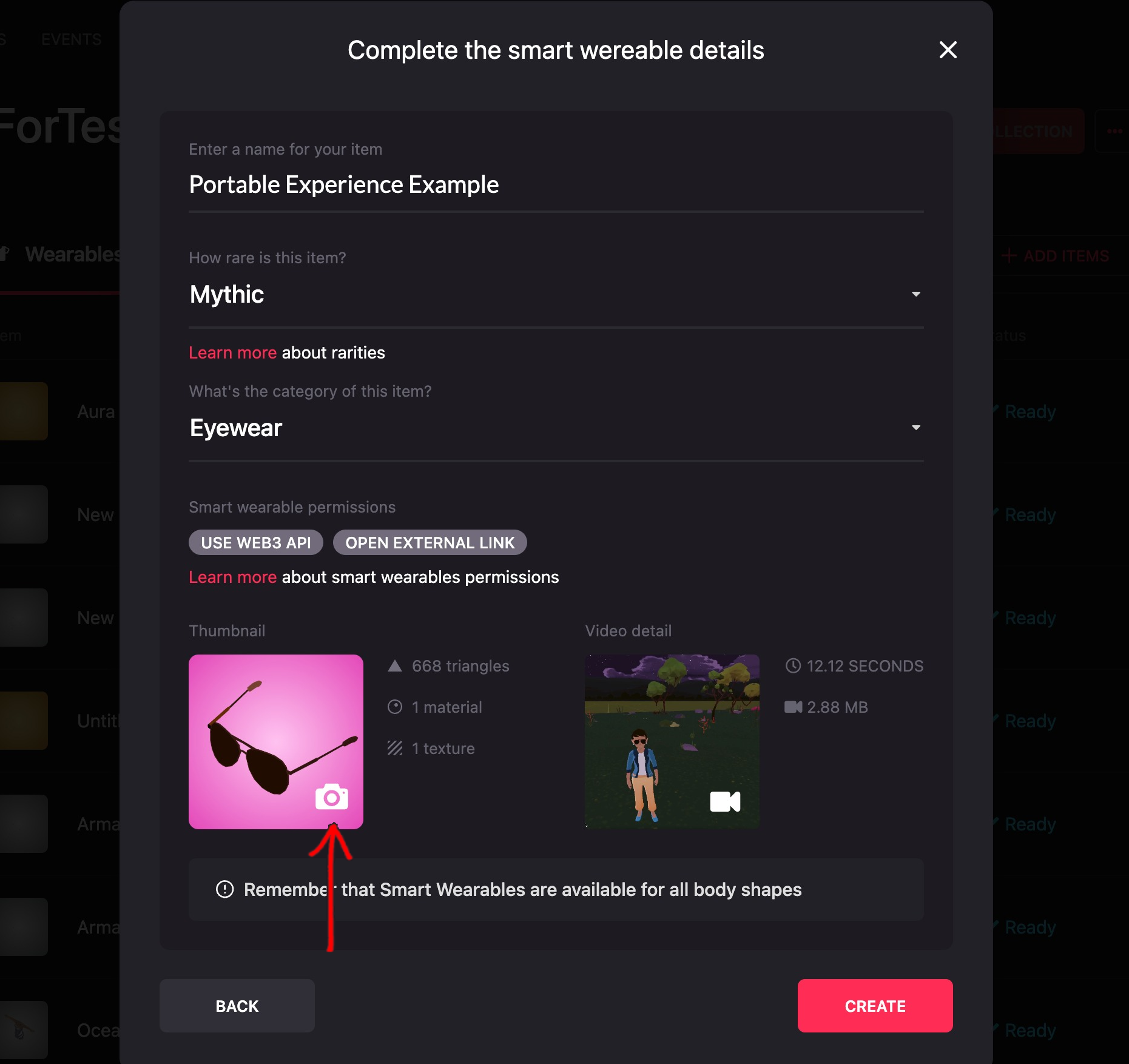 When you upload the video showcase, you will be asked to enter a name and define the rarity and the category. You can also add a thumbnail for the Smart Wearable if you like.