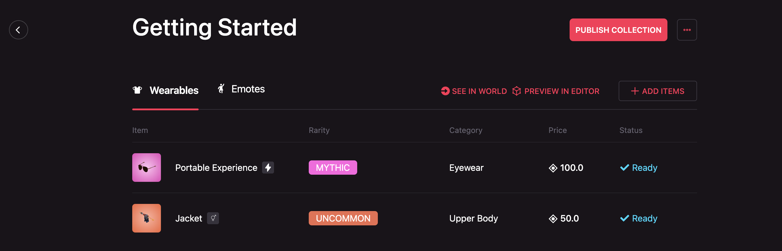 After that uploading your Wearables you will end up with a screen like this, that shows the items in your collection.
