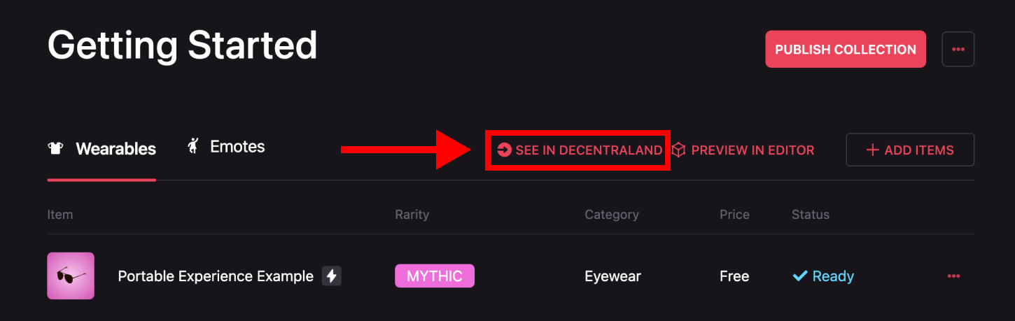 Even after testing the Smart Wearable in the editor, it’s important to check how it will look and behave in Decentraland. To try it there, go to the Collections tab. Select the desired collection and click the button See in Decentraland.