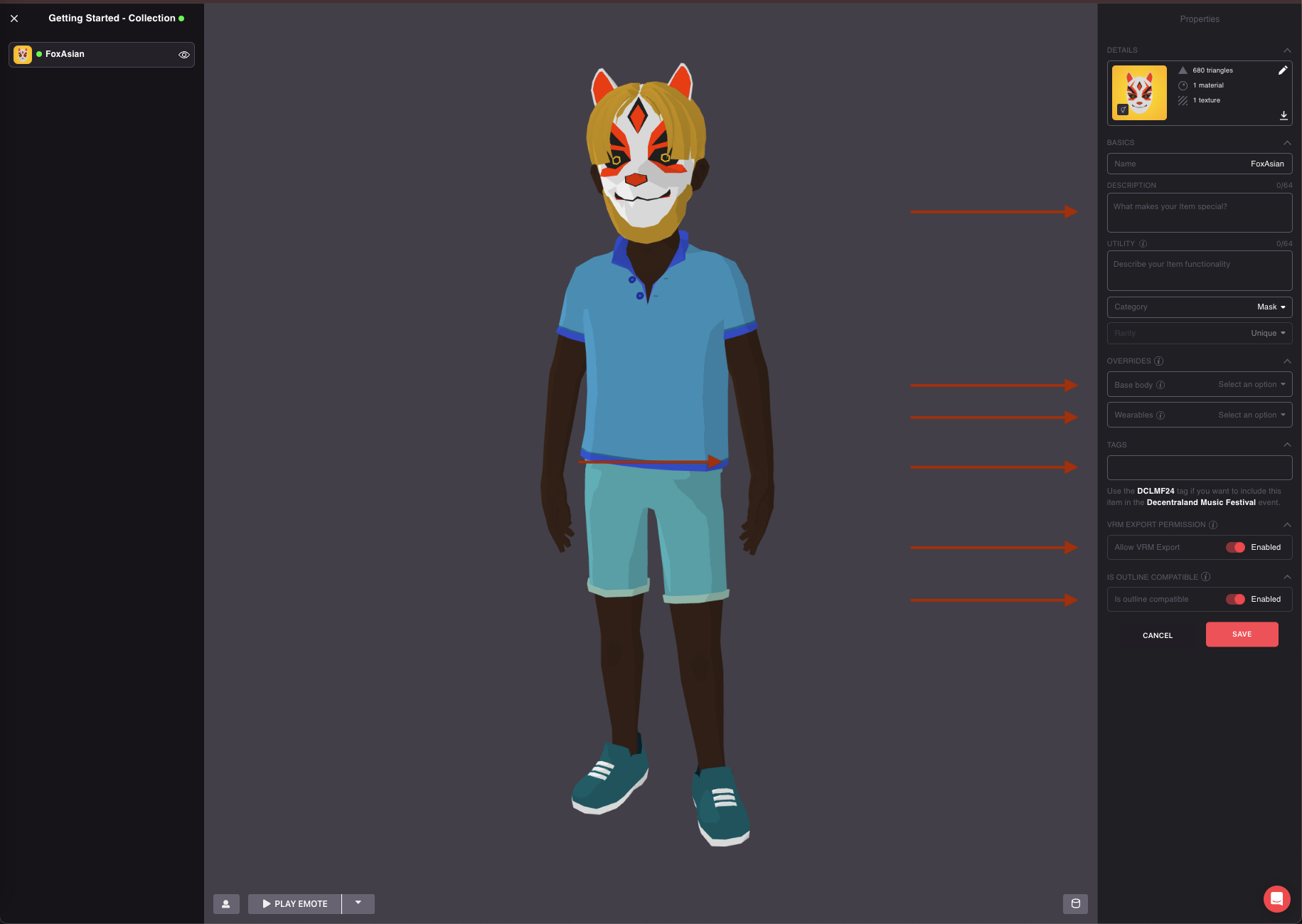 When this property is enabled, it will allow owners of your item to include it in VRM Avatar Exports so they can show it off outside of Decentraland.