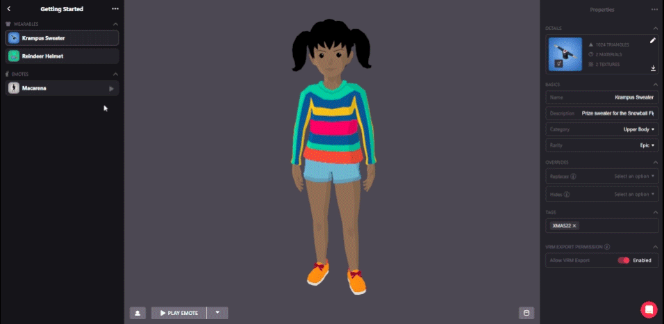Below the thumbnail you’re going to find the properties of your wearable, number of triangles of your model, number of materials and textures.